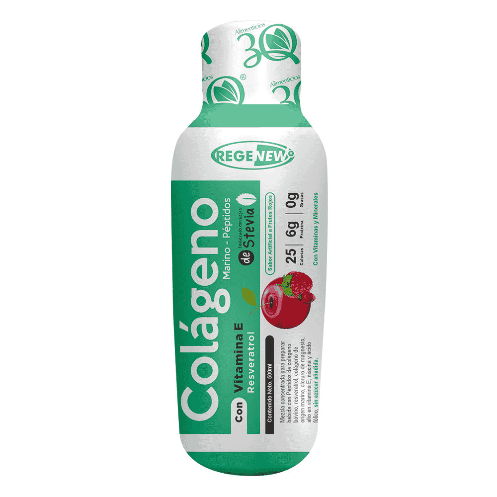 Colágeno marino con péptidos de colágeno bovino, resveratrol, colágeno de origen marino, cloruro de magnesio, alto en vitamina e niacina y acido fólico, sin azúcar añadida.