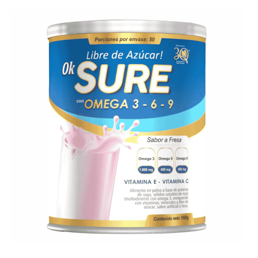 Ok Sure con Omega 3 6 9 Sabor a Fresa 1000 gr 3Q libre de azúcar, mezcla en polvo para preparar bebida a base de acai, con maltodextrina, omega 3, fortificado con vitaminas y minerales.